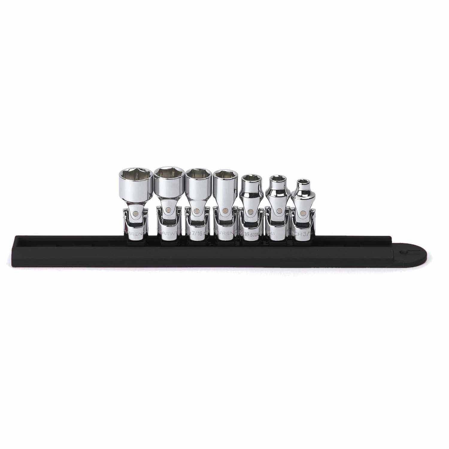 The GEARWRENCH 7 Piece 1/4" Drive 6 Point SAE Flex Socket Set features our universal socket design that allows users greater angled access to hard-to-reach fasteners. Our off corner loading design reduces fastener rounding allowing fasteners to be reused. Sizes included are: 3/16", 1/4", 5/16", 3/8", 7/16", 1/2", & 9/16". The set is stored on a socket rail for socket storage and organization.