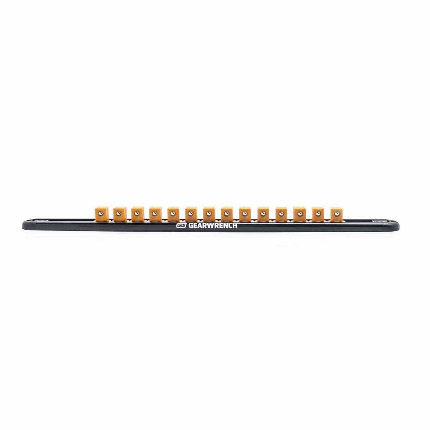 The GEARWRENCH Magnetic Socket Rails provides a complete and compact storage solution for sockets. The rotating clips let you load and unload sockets easily, while the ball bearing retention system holds the sockets securely in place.