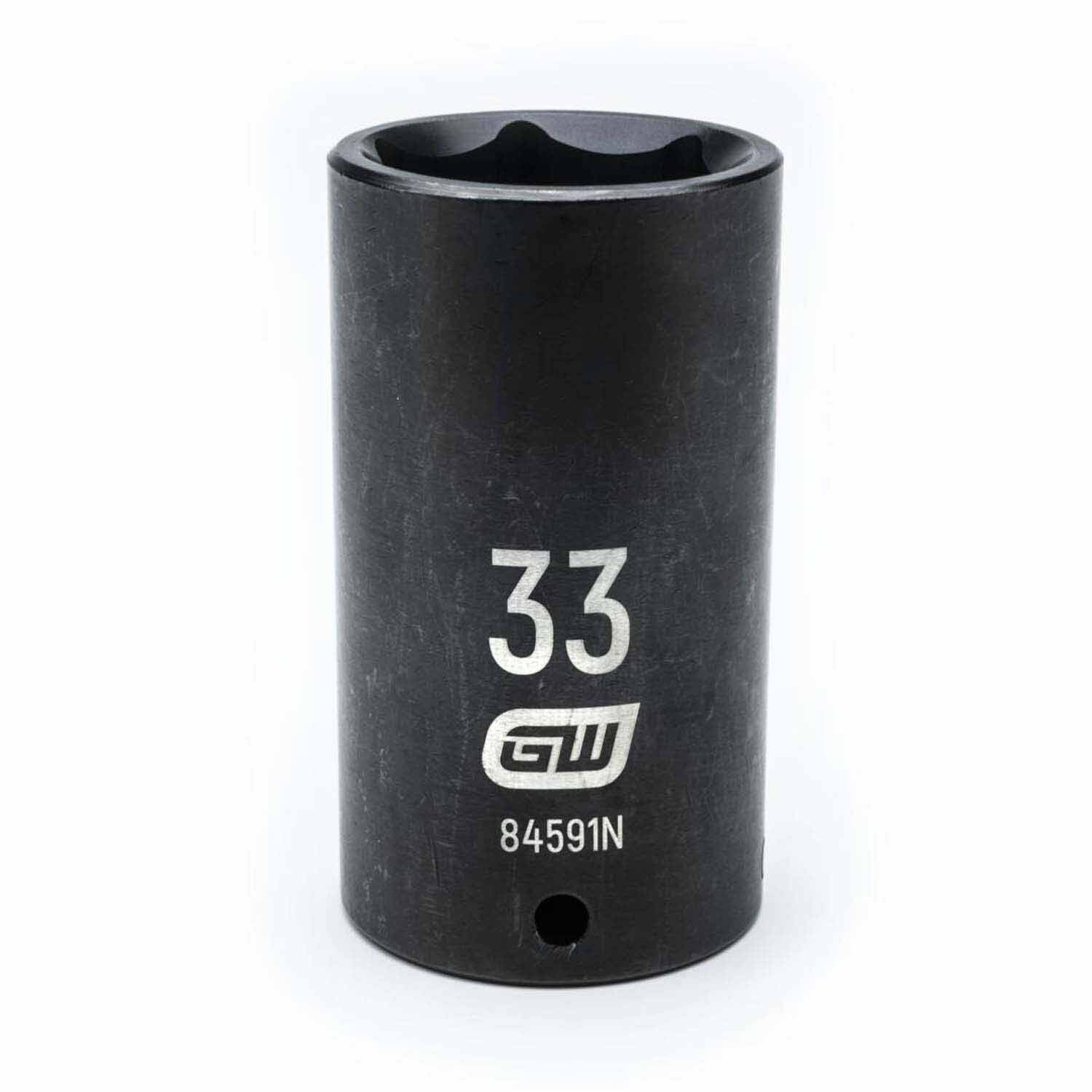 The Gearwrench 1/2" Drive 6 Point Deep Impact Metric Socket 33mm is designed for professional use, offering exceptional strength and durability with a black oxide finish to resist corrosion.