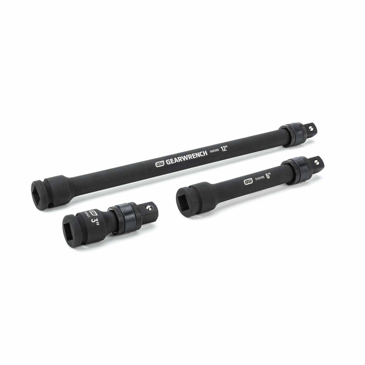 GEARWRENCH impact locking extensions are made from chrome molybdenum alloy steel for superior strength and durability. Drive end has a pin hole to use with pin and o-ring for securing to the impact wrench. The slide locking mechanism securely attaches socket to the extension. Extensions have a manganese phosphate coating for corrosion resistance. The extensions also feature high-visibility laser etched markings that are easy to read and allow the user to identify size quickly. The 84951N is a 3 piece 1/2 In. drive set that includes 3 In., 6 In., and 12 In. sizes.