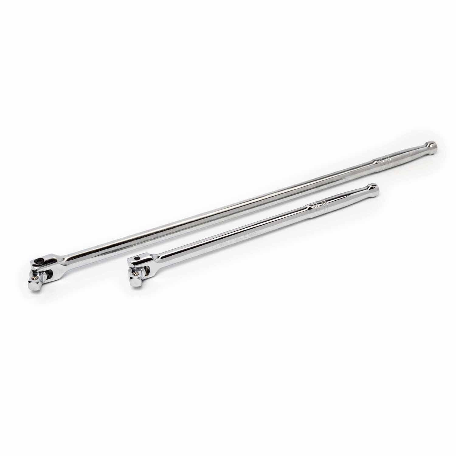 The 2 Pc. 1/2" Drive Flex Handle/Breaker Bar Set includes 15" and 24" breaker bars with ergonomic handles and a polished chrome finish for durability and ease of use.