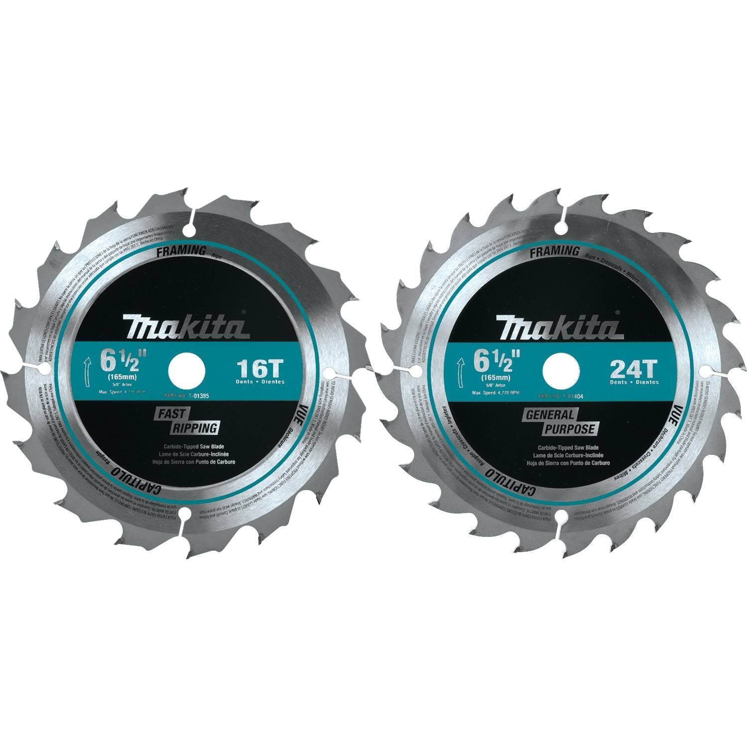 The Makita 6-1/2" 24T Carbide-Tipped Circular Saw Blade is built for faster cutting in a range of framing applications. The ultra-thin kerf design is engineered to cut smoother with minimal material loss and less drag on the motor, making it ideal for use with cordless circular saws. Additional features include the fully-hardened hand-tensioned steel saw plate construction for truer cuts. Engineered for use with 6-1/2” cordless circular saws with 5/8” arbor. The 6-1/2" Carbide-Tipped Circular Saw Blade Set (T-01426) includes two blades for added convenience.